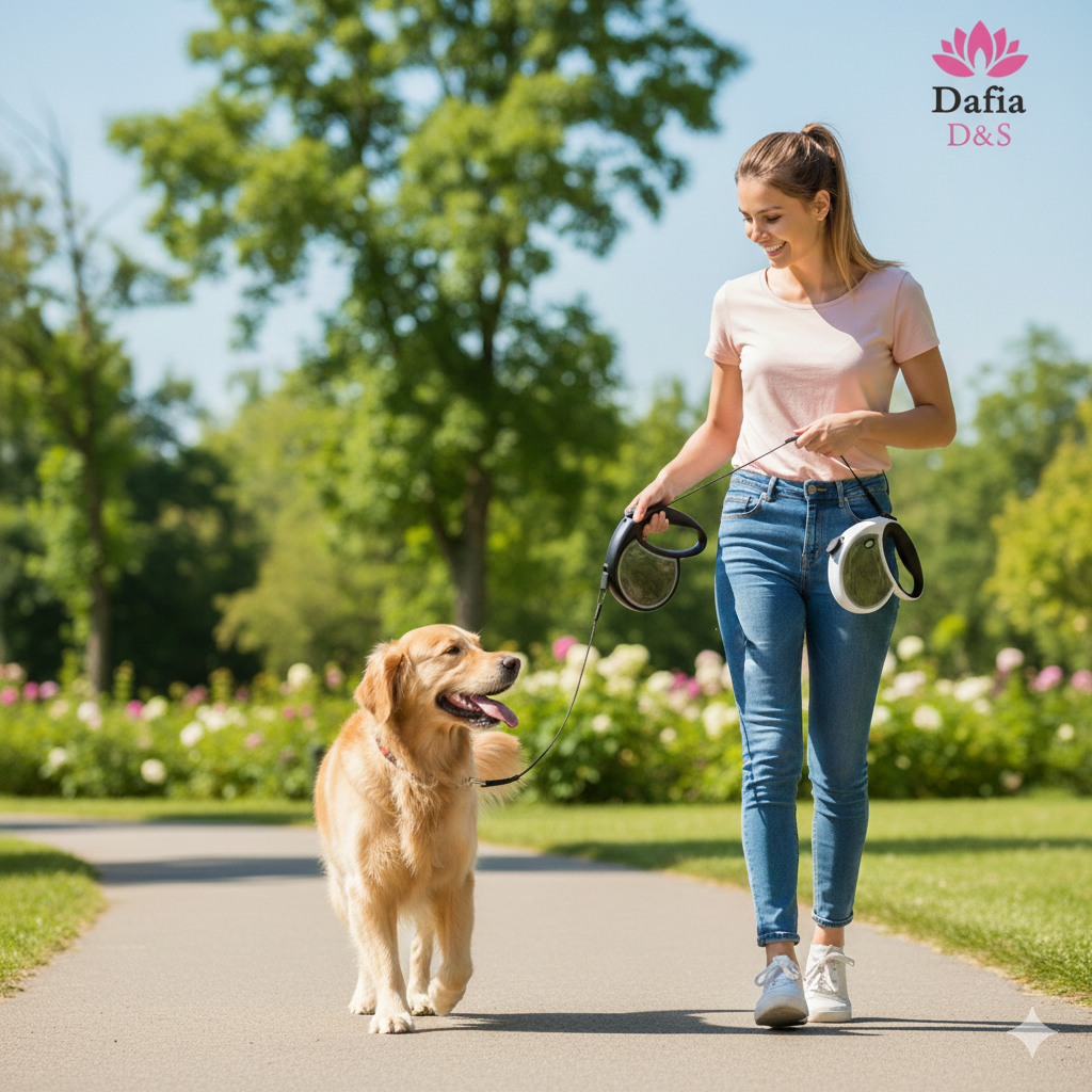 Su diseño ergonómico asegura un manejo sencillo y cómodo incluso en caminatas largas. La correa cuenta con un sistema retráctil eficiente que permite ajustar la longitud según el entorno, ideal para parques, calles o espacios abiertos.