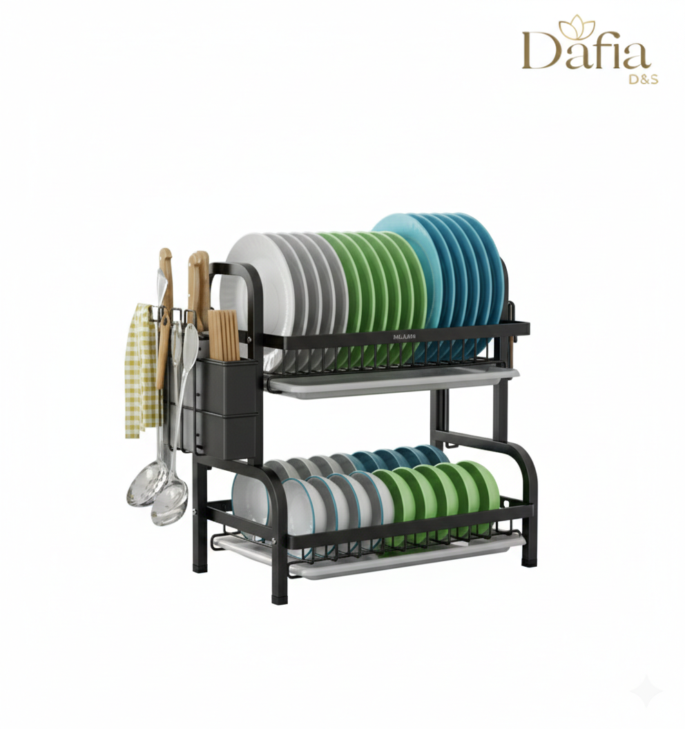 Con dos niveles bien diseñados, este escurridor ofrece suficiente espacio para platos, vasos y tazas. Además, incluye prácticos soportes para cubiertos, manteniéndolos a mano y bien ordenados.