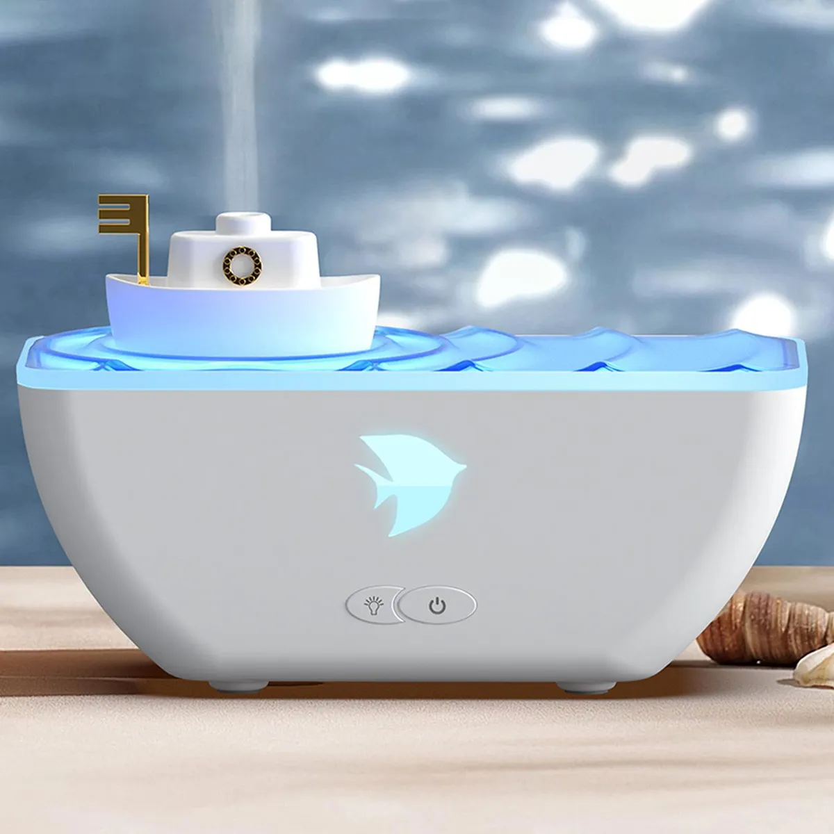 Gracias a su diseño compacto y estético, este humidificador se integra perfectamente en cualquier habitación, oficina o rincón especial de tu hogar. Su apariencia náutica eleva la decoración, combinando funcionalidad y estilo.