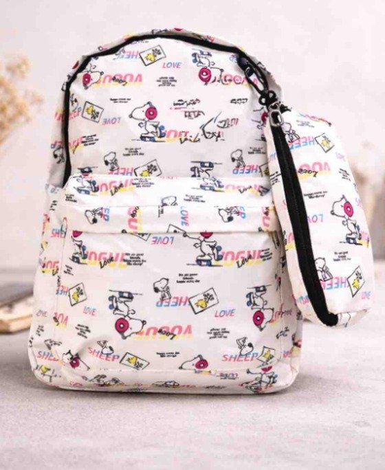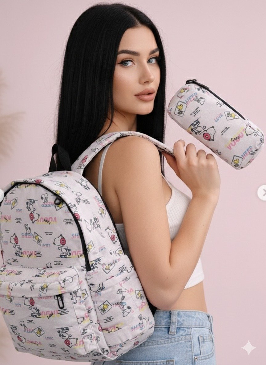 Mochila escolar de Snoopy con cartuchera a juego, ideal para organizar útiles con estilo divertido.
